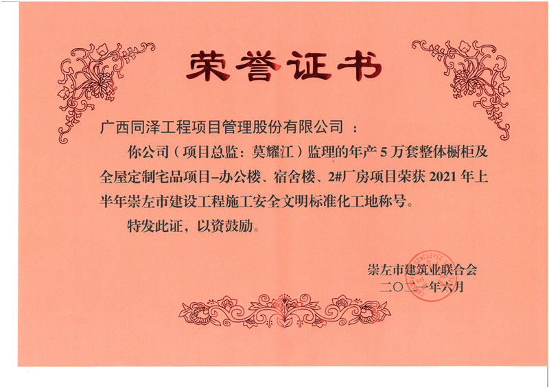 年產(chǎn)5萬(wàn)套整體櫥柜及全屋定制宅品二期項(xiàng)目榮獲2021年崇左市安全文明工地