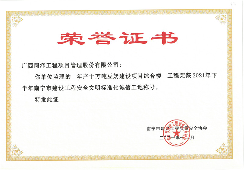 年產(chǎn)十萬(wàn)噸豆奶建設(shè)項(xiàng)目綜合樓項(xiàng)目榮獲2021年下半年南寧市建設(shè)工程安全文明標(biāo)準(zhǔn)化誠(chéng)信工地稱號(hào)